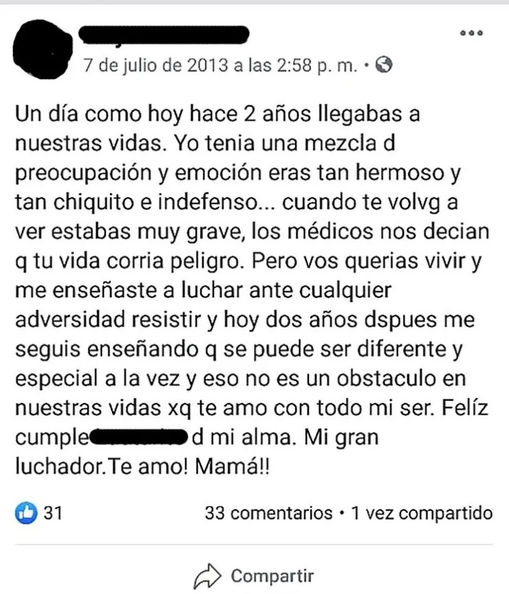 "Cuando te volví a ver estabas muy grave, los médicos nos decían que tu vida corría peligro, pero vos viviste y me enseñaste a luchar ante cualquier adversidad, resistir. Y hoy, dos años después, me seguís enseñando que se puede ser diferente y especial a la vez", escribió.  "Feliz cumple", comentó la educadora G.A, que hoy tiene de 45 años.