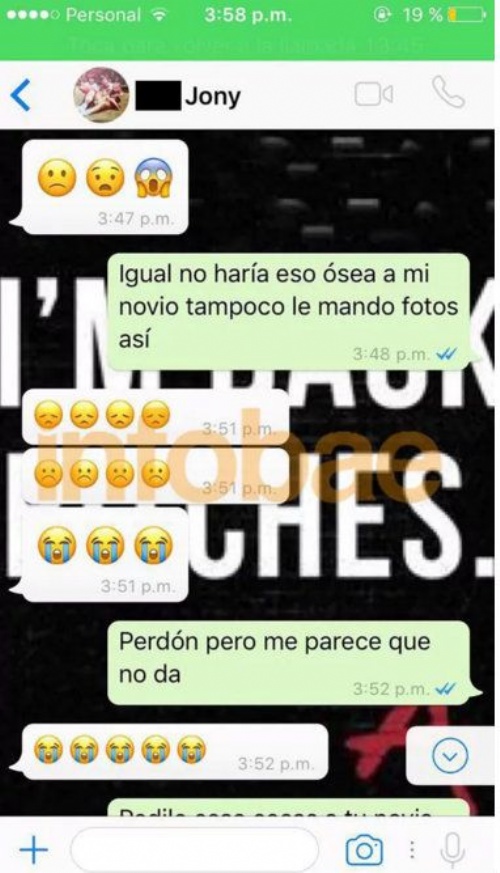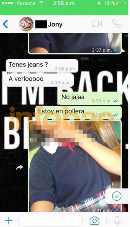 "Perdón, pero me parece que no da", le contestó ella. Luego, Fabbro se puso un poco insistente. Comenzó con emoticones, caras tristes, de llanto, caras de ansiedad. "¿Tenés jeans? A verlooo", dijo el jugador, antojadizo. "No, pollera", respondió ella. Finalmente, la niña le envió dos fotos a su padrino futbolista, ninguna en una pose sensual, ninguna imagen provocativa.
