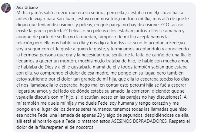 Fiamma Ruartez ayer salió a aclarar que era la novia del camionero. "Fede estuvo hasta el último conmigo, se fue aún siendo nosotros novios y para mí el siempre lo va a ser así que lo que digan los demás ni importancia. Sus palabras se las puede meter ya sabe en donde. Que falta de respeto por favor! Yo no tengo porque salir a darle explicaciones a nadie yo que sepa fede nunca tuvo mujer jamás se casó con nadie y obvio yo tampoco fui su mujer pero para el si lo era porque así fue como el me trababa de "mi mujer". Porque estuve viviendo con el, éramos novios así que por favor un poco más de respeto por el amor que el me tenía. Y sobre nuestra relación solo el y yo lo sabemos. Que feo que fede tenga que ver de en donde el esté lo que hablan sus seres más queridos", explicó en un posteo en Facebook.