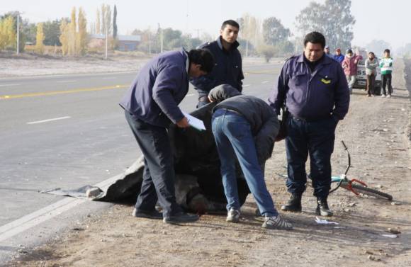 Los testigos mudos de la tragedia de ayer aproximadamente a las 7:30 era el cadáver de Héctor Andrés Pérez, de 67 años, que permanecía en la banquina Oeste de la ruta, indicaron fuentes de la Seccional 8va. También una de sus zapatillas, su bicicleta destrozada, una rueda separada del cuadro con la marca del choque, y su asiento que fue a parar a la otra banquina. Sólo unos trozos de plástico gris del paragolpe, algunos vidrios del parabrisas y unos pequeños pedazos de mica, señalaban los únicos indicios y evidencia de ese vehículo desconocido que atropelló a este jubilado sobre la ruta 40, a metros de la calle llamada Mendoza Vieja, en el distrito de Colonia Fiscal Norte.