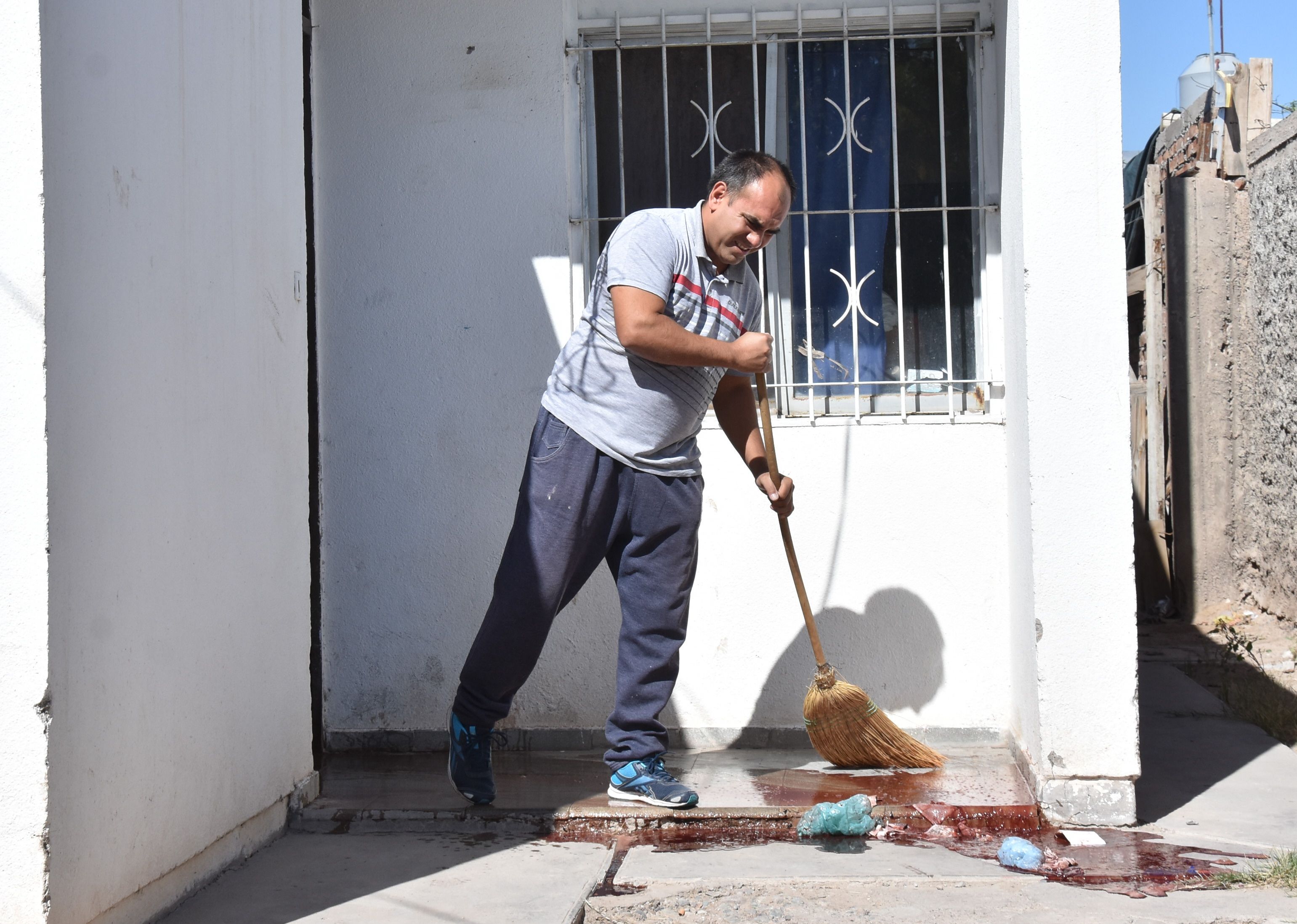 Macabro. Uno de los familiares de Aldo Pérez, limpiaba ayer la gran cantidad de sangre que perdió por el cuchillazo.