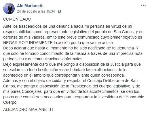 Tras conocerse la denuncia, que fue caratulada como "abuso sexual simple", el concejal Marianetti negó "rotudamente" las acusaciones en un mensaje difundido a través de su cuenta de la red social Facebook.