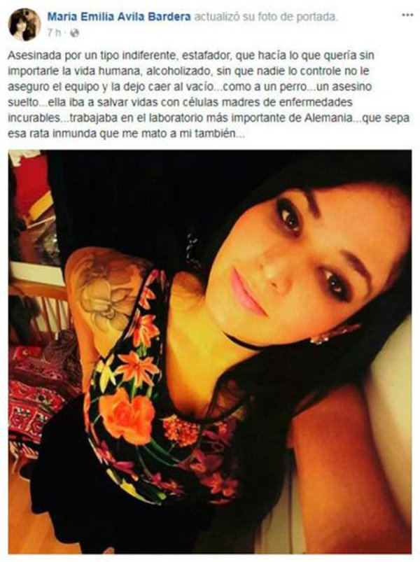 “Asesinada por un tipo indiferente, estafador, que hacía lo que quería sin importarle la vida humana, alcoholizado, sin que nadie lo controle. No le aseguró el equipo y la dejo caer al vacío, como a un perro. Un asesino suelto”, fue lo que escribió Bardera en el mensaje que se viralizó en las redes sociales.