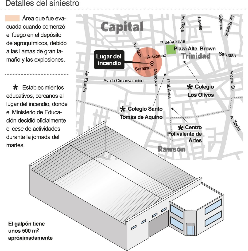 Recién cerca de las 5, las dotaciones pudieron controlar el fuego, pero la gruesa columna de humo no paró incluso hasta pasado el mediodía. Frente a eso y por precaución, se ordenó a los vecinos que cerraran puertas y ventanas. También se suspendieran las actividades en tres escuelas cercanas (ver infografía). No obstante, el director de Protección Civil, Alfredo Nardi, llevó tranquilidad al aclarar que "el denso humo tiene las características de un incendio típico importante, pero no es tóxico".