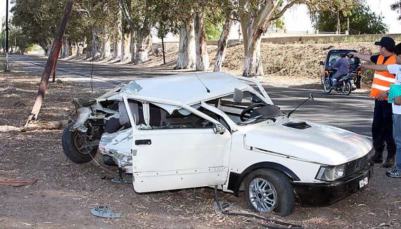 Uno de los casos más impresionantes ocurrió en calle Nacional, unos 400 metros al Norte de Sarmiento o calle Larga. Un vecino del lugar, Domingo Paredes, comentó ayer que a las 6 se despertó con su mujer por un violento estruendo y que lo primero que pensó fue en un vehículo estrellado contra algún eucalipto. Pero cuando salió se topó con un Fiat 147 irreconocible y dos jóvenes en el piso, el conductor, sangrando por un gran tajo en su cabeza, y una joven que no estaba tan afectada. Más tarde los policías de la comisaría 19na. de San Martín al mando del comisario Edgar Bravo, reconstruirían que el auto volvía de un boliche de Angaco, que transitaba hacia el Sur, que se salió hacia su mano derecha y que se destruyó al estrellarse contra la columna metálica del alumbrado público y haber partido en dos un poste de madera del tendido eléctrico. En la policía, no descartan que el conductor hubiese estado ebrio.