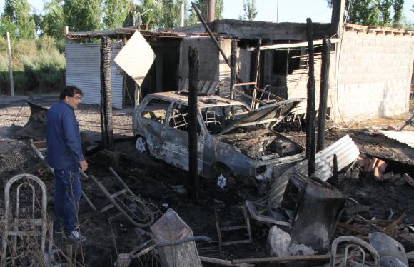 Cajas comentó que al llegar a su casa se encontró con los vecinos luchando por apagar el fuego y con llamas que envolvían su coche y que alcanzaban unos 4 m de altura. A los minutos, una dotación de bomberos de Rawson terminó de extinguir el siniestro, que destruyó el auto (modelo ’98), un esmeril, 2 bicicletas que eran de sus hijas, sillas, una carretilla, una cocina, una pileta de lona y otros elementos y además daño el lavadero, el tanque de agua y parte de una pieza.