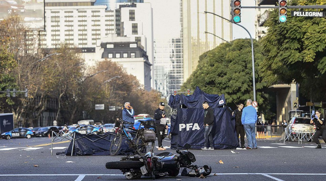 Dos de los delincuentes escaparon en la moto por la avenida Del Libertador en dirección hacia el norte, perseguidos por el conductor del auto que, al llegar a la intersección con la calle Cerrito, los chocó de atrás con el paragolpes.