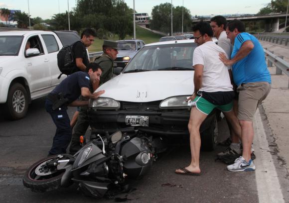 �Un motociclista quedó ayer a las 19.10 con moto y todo debajo de un Renault 19 tras un choque en el anillo interno de avenida Circunvalación, al Este de General Acha, Capital. Según la Policía, Sergio Balmaceda (44) guiaba una Yamaha R6 600cc, frenó por un camión y, de atrás, lo chocó el auto. Sufrió politraumatismos.