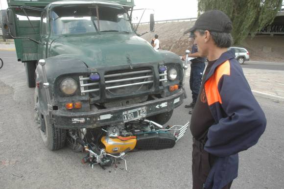 El conductor de una moto Sumo 125cc. terminó ayer con fractura expuesta en su pierna derecha y golpes en todo el cuerpo, luego de chocar y terminar bajo las ruedas de un viejo camión Bedford guiado por Aldo Mengine (57). Ocurrió a las 8.40 en el cruce de José Dolores y General Acha, Rawson. La peor parte del siniestro se la llevó Mario Orlando Barbosa, de 47 años, informaron en la Policía.