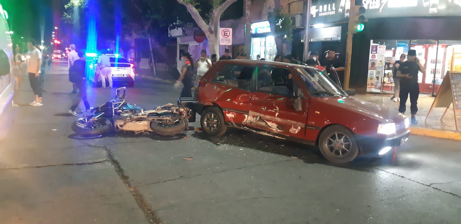 Según testigos del hecho, un Fiat Uno circulaba de Oeste a Este por Libertador y, al llegar a Salta, giró hacia el Norte a pesar de que está prohibido y un motociclista que viajaba por la misma arteria pero en dirección en contraria lo impactó de lleno.