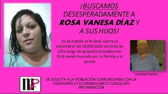 Los familiares de la mujer que se encuentra desaparecida desde anoche temen lo peor, pues aseguraron que su expareja además de agredirla la amenazó de muerte. "Le pegó y le dijo que la iba a matar", afirmó Karen, una sobrina de Rosa Vanesa Díaz (33), la víctima. El drama es que además tampoco se sabe nada de los 5 hijos de la pareja (13, 11, 3 y gemelas de 5 años).