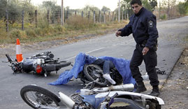 De nuevo los accidentes en moto se cobraron ayer la vida de dos jóvenes. Por la mañana, un joven murió en un choque de tres motos en Colonia Rodas, Rawson. Lo llamativo es que los otros involucrados en la violenta colisión se fugaron y por eso en la Policía no descartaban nada. Y anoche, al cierre de esta edición, un muchacho identificado en la Policía como Gonzalo Balmaceda (25) se mató al estrellarse en una moto Brava 110cc contra la parte trasera de un camión Ford Cargo estacionado sobre la banquina Norte de calle 5, 100 m al Este de Hipólito Yrigoyen.