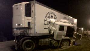 Pasada la medianoche, un camión marca Volkswaguen, terminó siendo arrastrado hasta la banquina por su propio acoplado, tras realizar una mala maniobra.