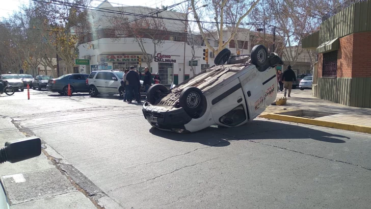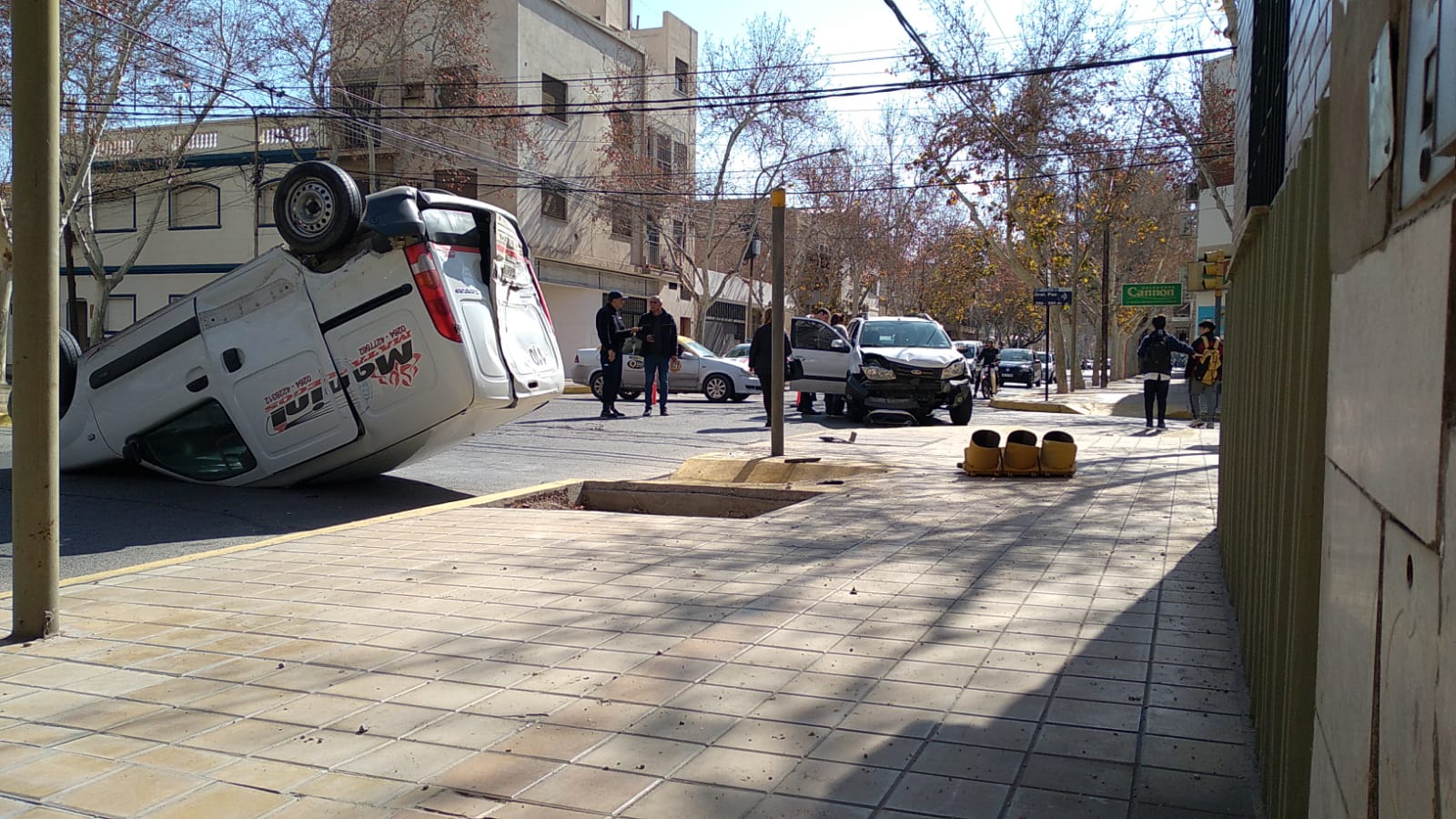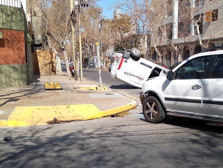 Un semáforo desmembrado, la trompa de un auto destrozada y un vehículo dado vuelta, es el saldo de un espectacular choque en pleno microcentro sanjuanino. El hecho ocurrió pasadas las 13, en el cruce de calles General Paz y Tucumán.