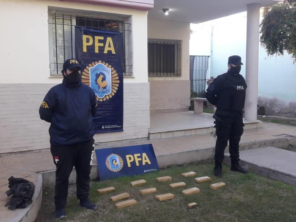 Todo empezó por una persecución de un vehículo que evadió un control sobre las 12:30 de este sábado en Ruta 40 casi calle Italia, en Albardón. El primer resultado fue que los dos sujetos que viajaban en el vehículo arrojaron por una de las ventanillas un bolso negro que, luego de la requisa, entregó que en su interior había 12 panes y medio de marihuana, el equivalente a unos 9 kilogramos.