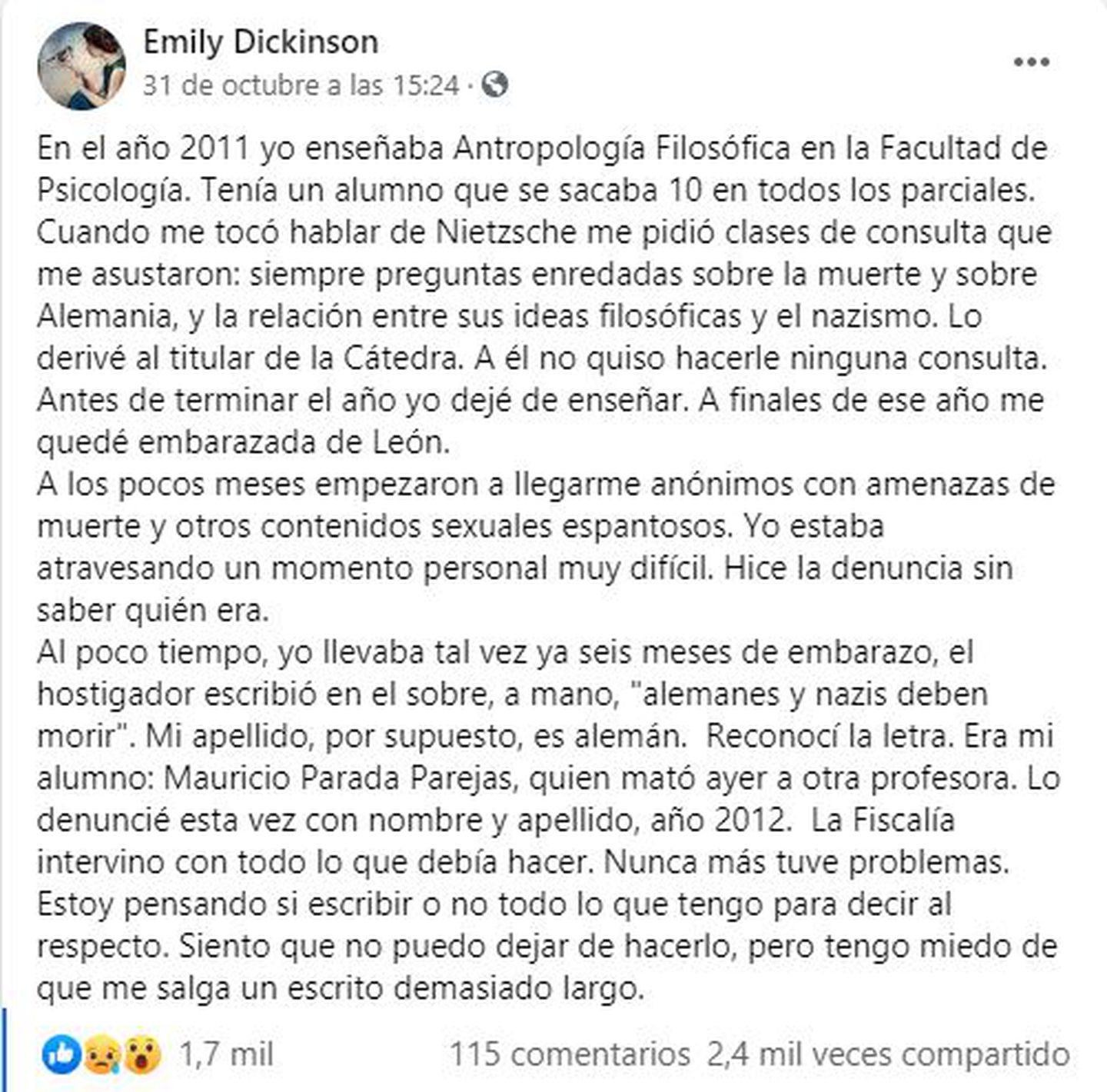 Al poco tiempo, yo llevaba tal vez ya seis meses de embarazo, el hostigador escribió en el sobre, a mano, “alemanes y nazis deben morir”. Mi apellido, por supuesto, es alemán. Reconocí la letra. Era mi alumno, quien mató ayer a otra profesora. Lo denuncié esta vez con nombre y apellido, año 2012. La Fiscalía intervino con todo lo que debía hacer. Nunca más tuve problemas.