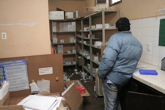 Al menos tres puertas rotas. Las rejas rotas y decenas de medicamentos esparcidos en el sector de Farmacia. Algunas carpetas y cajas tiradas en la administración. En la enfermería todo revuelto, con la heladera abierta y algunas vacunas afuera, y con la consiguiente desaparición de instrumentos y equipos médicos. Esto es lo que dejaron los vándalos que ayer en la mañana entraron al centro de salud de Villa Unión, Chimbas, y que otra vez robaron y provocaron daños en el edificio en el que diariamente atienden alrededor de 200 personas.