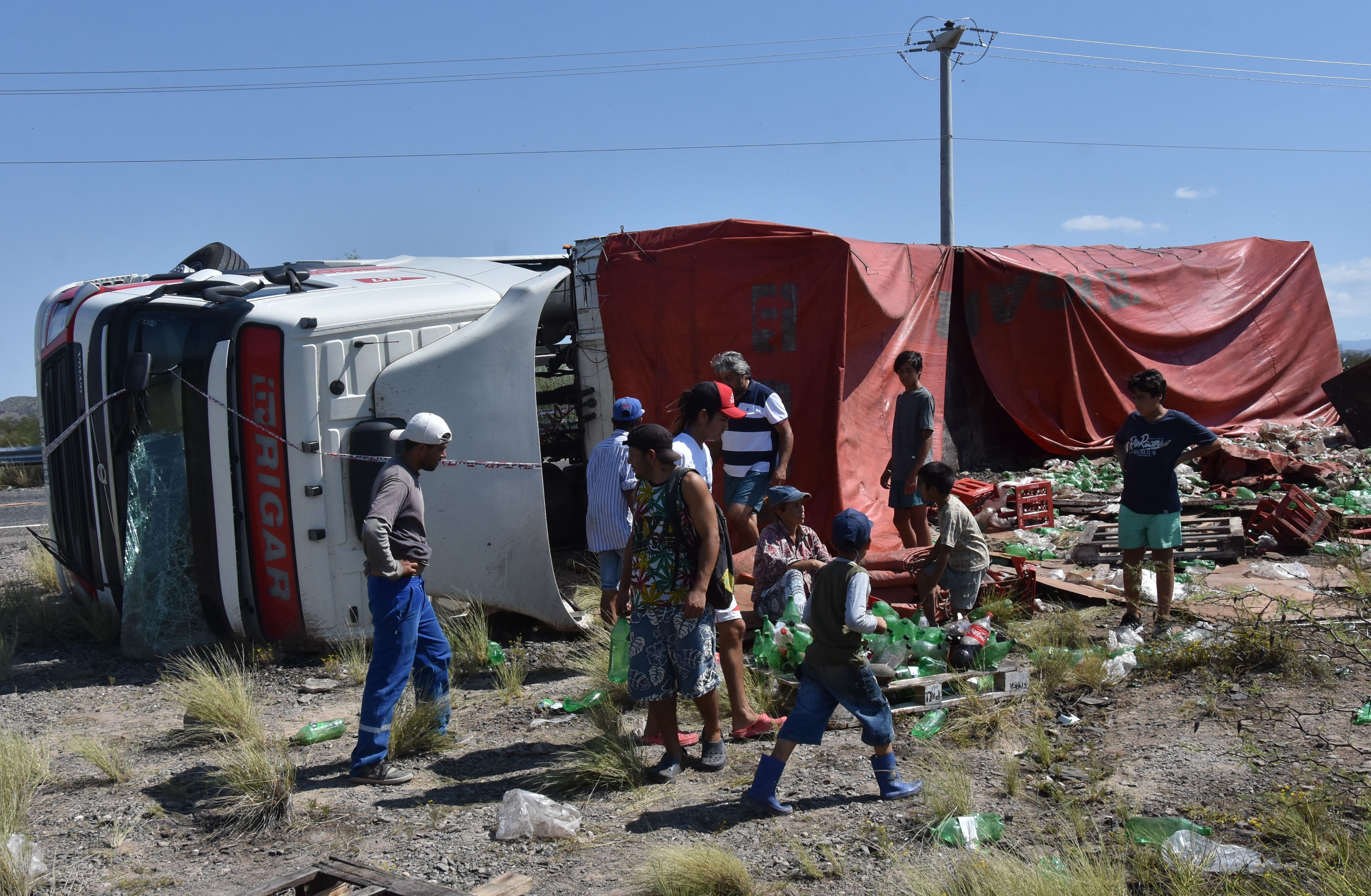 Faltaban unos minutos para las 10 de ayer cuando un camionero cordobés no pudo mantener sobre la ruta 141 el semirremolque Volvo de la firma Rigar en el que traía a la Capital sanjuanina miles de gaseosas, y en pleno descenso en una zona de curvas en la Cuesta de las Vacas, Caucete, terminó de costado con toda la carga desparramada. Entonces ocurrió el necesario auxilio al chofer Esteban Espíndola (29), que apenas sufrió algunos golpes, un corte en un brazo y quedó fuera de peligro. Pero instantes después se generó un frenesí por apoderarse del cargamento, botellas de Coca Cola y Sprite.