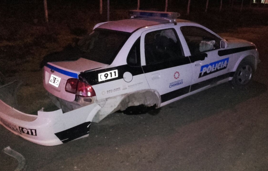 Un móvil de la Policía Comunal de Chimbas terminó con el tren trasero destruido en la madrugada de ayer, cuando participaba con otros patrulleros de la Policía en una persecución de dos sujetos a bordo de una Renault Kangoo que habían huido hacia Albardón luego de amenazar y lastimar a un joven en Mendoza y Neuquén, Chimbas, para robarle el teléfono celular. Ocurrió en los primeros minutos de ayer. Los delincuentes abandonaron el vehículo en la zona del Dique Avalos, Albardón, y siguieron a pie, pero fueron capturados en la Ruta 40. Tienen 18 y 15 años, informó la Policía.