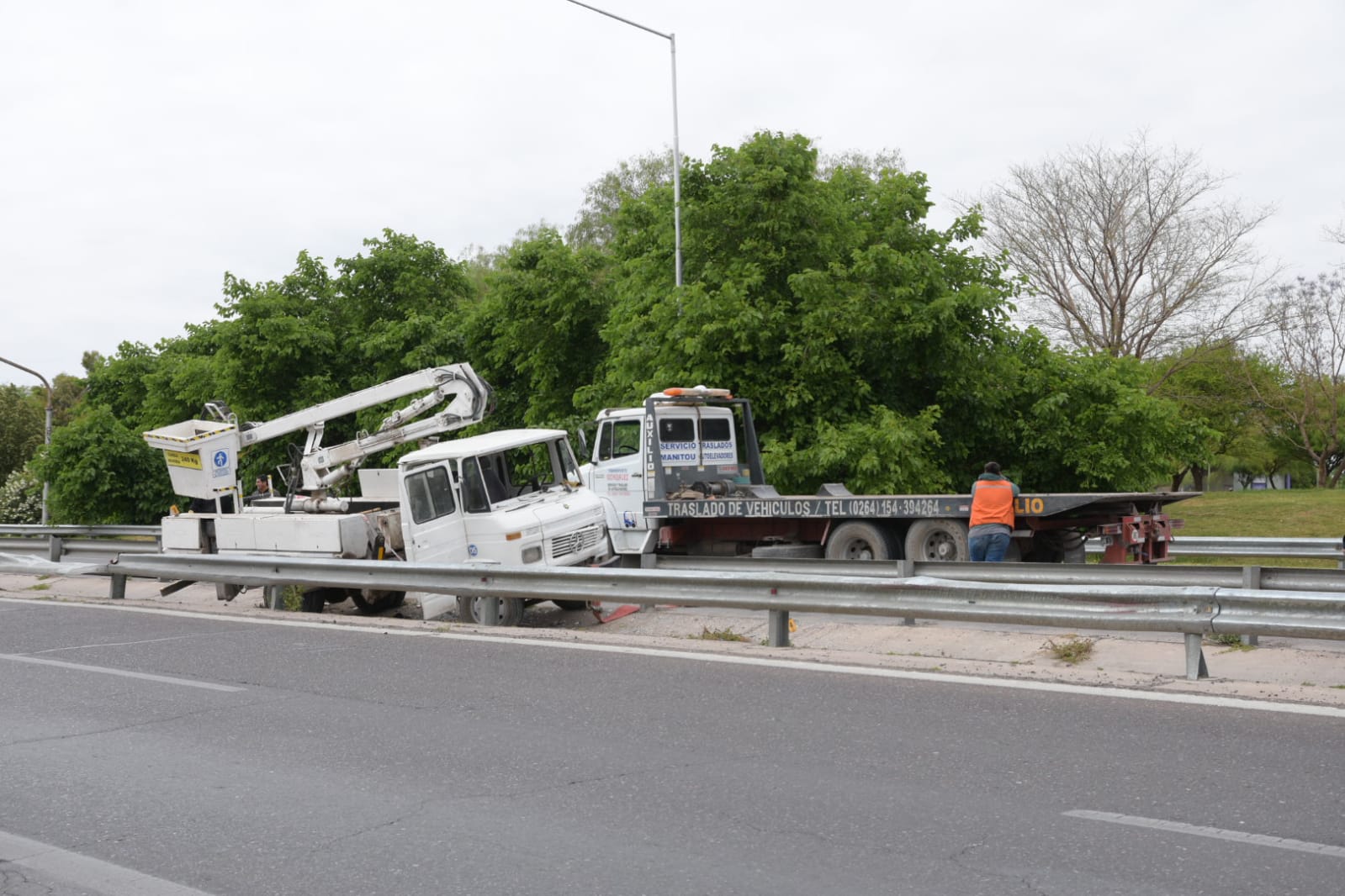 Aparentemente, el camión Mercedes Benz que trasladaba una grúa habría sufrido un desperfecto técnico, que l llevó a desviarse y quedar en el cantero central.