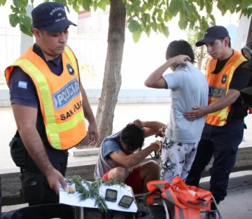 �Dos sujetos en moto fueron detenidos ayer en la mañana en 25 de Mayo, casi Alem, Capital, con dos plantas de marihuana y picadura de esa droga. Jonathan Ahumada tenía las plantas y fue apresado por el cabo Martín Poblete (Policía Comunal) con apoyo de los cabos Ramos y Morales, informó la Policía.