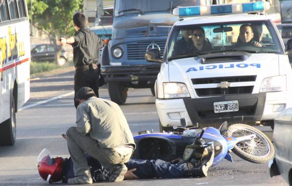 Un cabo de la policía terminó ayer a las 8.15 con el codo derecho luxado y con otros golpes en su cuerpo tras colisionar en su moto con un auto en la intersección de Ruta 40 y Porres, Chimbas. Ceferino Videla (42), el uniformado herido, viajaba a trabajar en la seccional 3ra. de Trinidad cuando se accidentó, informaron fuentes policiales.