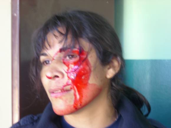 Cuatro policías resultaron lesionados y un patrullero dañado ayer en el barrio Laprida, Chimbas, donde llegaron a detener a un sospechoso acusado de robarle a los vecinos. El operativo terminó con el arresto de dos hermanos menores del detenido, uno de los cuales causó la lesión más grave: un corte en la ceja izquierda de la agente Miriam Ontiveros (foto), quien recibió dos puntos en un centro sanitario.