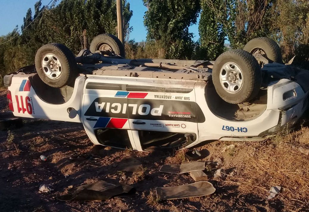 Tres policías identificados como la oficial Rocío Rodríguez y los agentes Ismael Mereles y Cristian Fornari, terminaron a las 6,30 de ayer con lesiones menores luego de protagonizar un vuelco en el patrullero (una camioneta) en la que transitaban por España, entre las calles 6 y 7, en Pocito. Investigan las causas del siniestro.