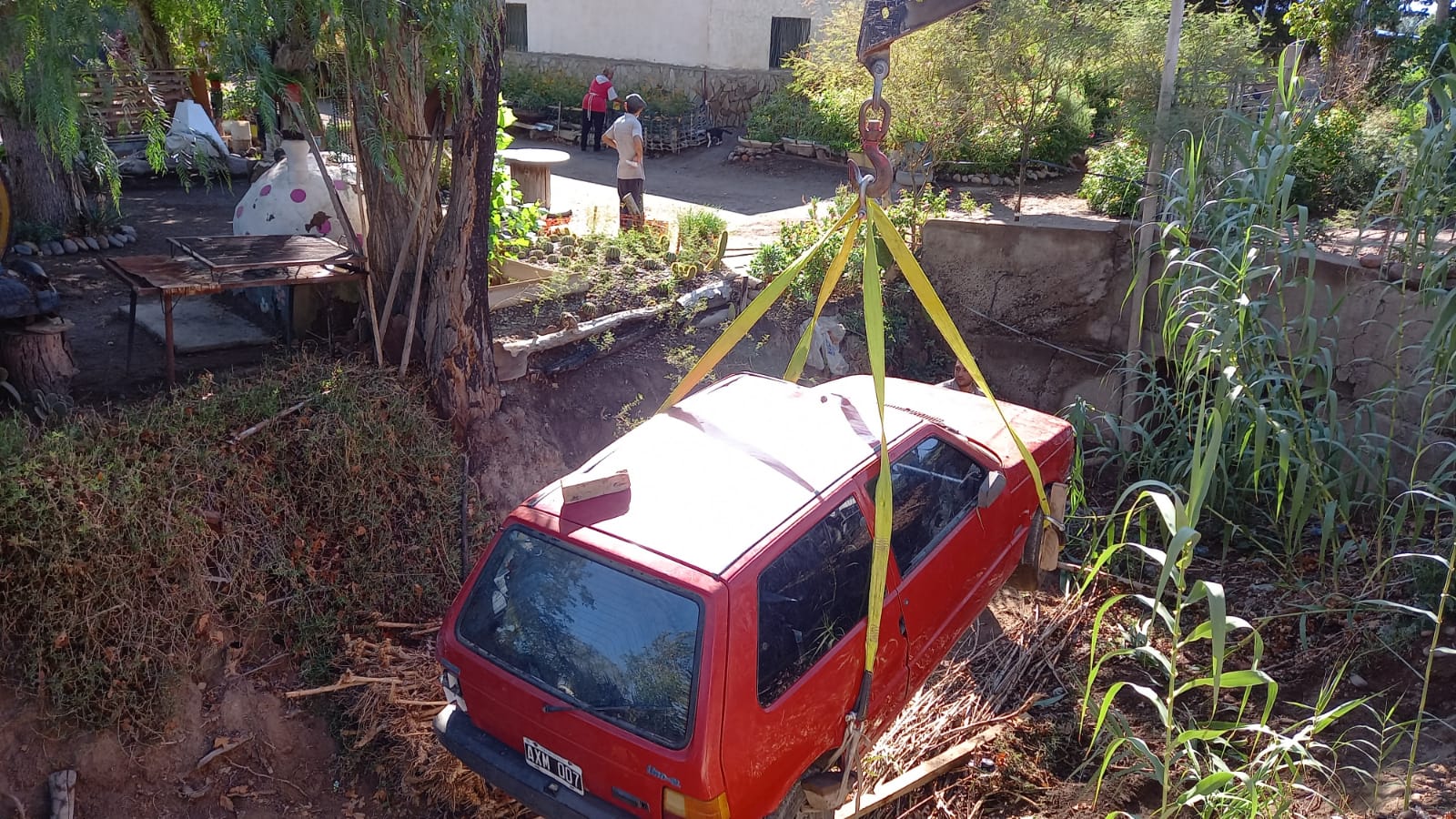 De acuerdo a lo manifestado por el conductor de un Fiat Uno, quiso esquivar una moto y al dar el volantazo perdió el control del vehículo y terminó en un zanjón de unos 2 metros de profundidad, quedando volcado.