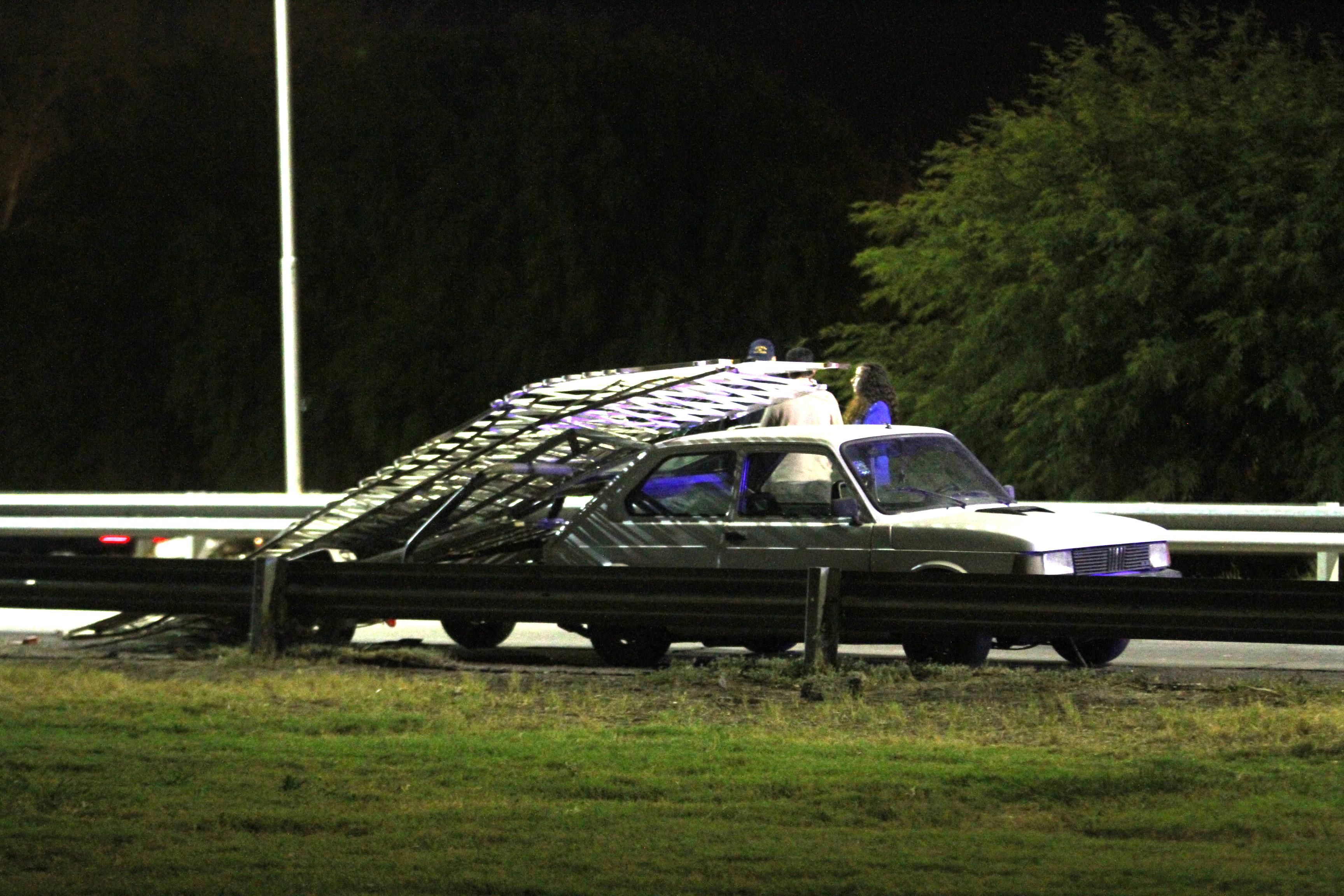 Según las fuente, una mujer de apellido Leiva intentó esquivar una reja que se desprendió de un carro que llevaba un vehículo delante de ella y por la maniobra, el Renault quedó dado vuelta. La mujer iba con sus dos hijos, quienes no sufrieron lesiones.