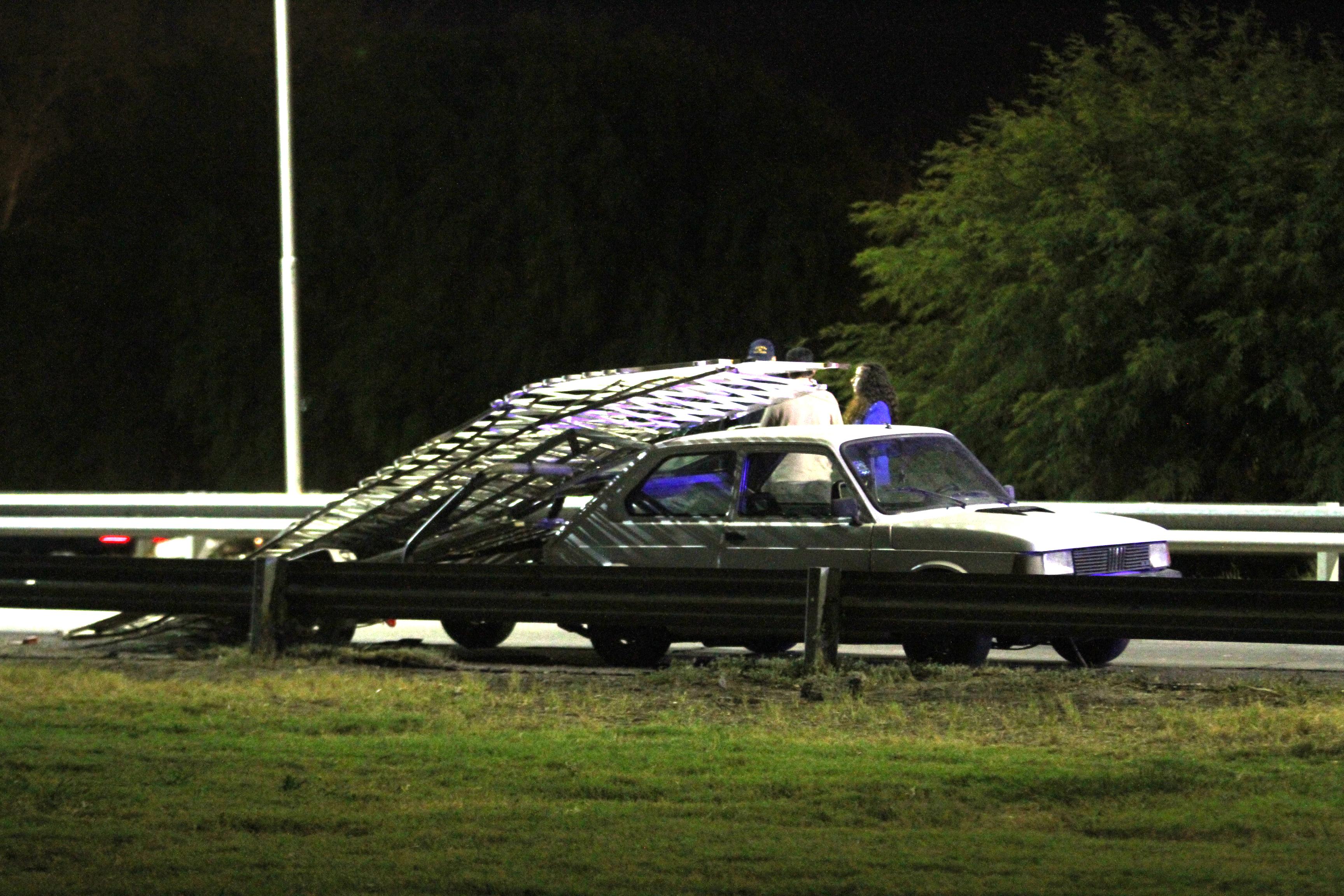 Según las fuente, una mujer de apellido Leiva intentó esquivar una reja que se desprendió de un carro que llevaba un vehículo delante de ella y por la maniobra, el Renault quedó dado vuelta. La mujer iba con sus dos hijos, quienes no sufrieron lesiones.