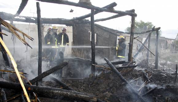 Rosa recuerda que eran las 18.15 cuando vio el fuego en la parte trasera del rancho. La joven sacó a sus dos hijos y a sus hermanitos y se cruzó a la casa de su abuela a pedir auxilio. ‘El viento hacía más grandes las llamas. La gente tiraba agua y tierra, pero no podía parar el fuego’, relató Rosa. Más tarde llegó una dotación de Bomberos a cargo del oficial Rubén Castro, pero pese a que sofocaron el siniestro, el daño ya estaba hecho: se quemaron un frezzer, un TV, dos modulares, una cocina, camas, juego de mesas y sillas, una netbook y la ropa de la familia. Sólo quedaron en pie algunas paredes. No se salvaron ni los documentos de Elena Agüero, su esposo y los cinco hijos que viven con ellos.
