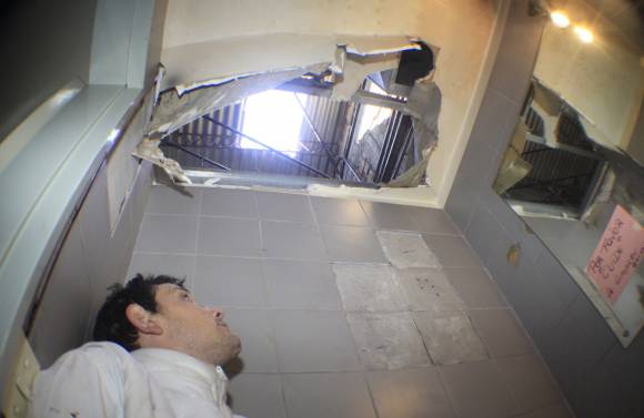 Después de hacer el boquete en el techo, los ladrones descendieron entre los caños de la instalación eléctrica hasta el techo de yeso del baño del local y lo rompieron.