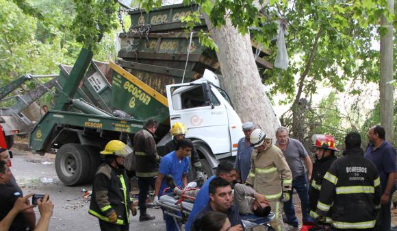Un camionero sufrió a las 15,30 de ayer una fractura expuesta en su pierna derecha, al estrellarse contra un árbol en el camión con acoplado Volkswagen 17220 que guiaba rumbo al Sur por Pellegrini (300 metros al Sur de Libertador) en Rivadavia. Según la Policía, Miguel Ángel Muñoz (41), habría dicho que se accidentó porque alguno de los 6 contenedores que llevaba en el vehículo tocó con una rama y lo hizo perder el control. Bomberos voluntarios de Chimbas y del cuartel central rescataron al chofer.
