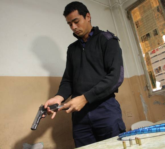 Un sujeto fue detenido ayer por policías de la Seccional 17ma por amenazar con una pistola a su vecina del Bº Lebensohn. Chimbas. El sujeto es Claudio Tallata (28), a quien le secuestraron una pistola 11.25 con 4 proyectiles, informaron en la policía. Investigan si esa arma fue robada a algún miembro de una fuerza de seguridad.