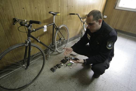 Dos jóvenes, de 17 y 18 años, cayeron ayer a las 00.30 cuando policías del Comando Urbano les secuestraron 4 celulares, un mp3, una cadenita de oro, $115, 2 cortaplumas y un revólver calibre 22 corto con 4 cartuchos (foto) cuando pedaleaban por Mitre y Caseros, Capital. La mayoría de las cosas se las robaron a otro chico en la Terminal, según la Policía.