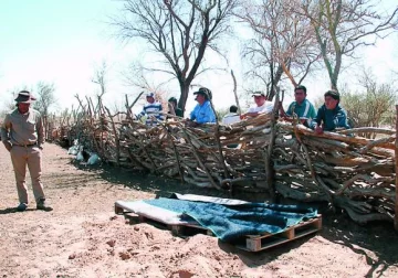 ESCENARIO. La fosa cubierta donde estaba el cuerpo enterrado de Zacarías Azcurra. Alrededor del corral, los vecinos y puesteros entre los que circula la versión de que el sospechoso preso por el homicidio no está del todo en sus cabales.