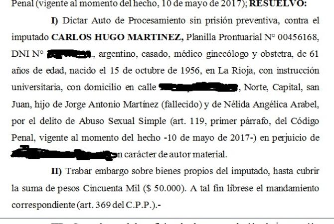 El juez de la Segunda Circunscripción, Pablo Oritja, procesó por el delito de abuso sexual simple al ginecólogo Carlos Martínez. La resolución judicial es por la primera denuncia que se hiciera en Jáchal y que data de mayo del año pasado.