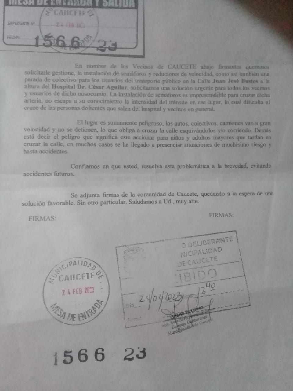 A raíz de la tragedia, en Caucete comenzó a circular la nota que había sido presentada el 24 de febrero de este año al Concejo Deliberante. En la misma, firmada en su mayoría por vecinos del Barrio Área 2, se solicitaba "la instalación de semáforos y reductores de velocidad" en Juan José Bustos a la altura del hospital. "Solicitamos una solución urgente para todos los vecinos y usuarios de dicho nosocomio. La instalación de semáforos es imprescindible para cruzar dicha arteria, no escapa a su conocimiento la intensidad del tránsito en ese lugar, lo cual dificulta el cruce de las personas que salen del hospital y vecinos en general", dice el escrito.