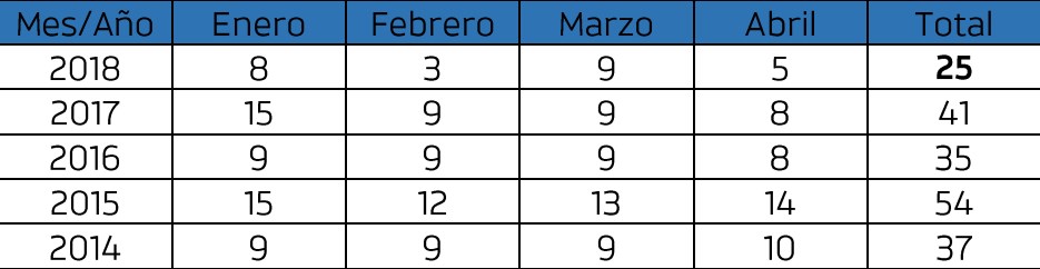 El Observatorio de Seguridad y Movilidad Vial de San Juan brindó esta mañana datos estadísticos sobre los accidentes de tránsito ocurridos en la provincia durante los meses de enero, febrero, marzo y abril de 2018. En algunos casos, con datos llamativos. En comparación con años anteriores, este es el que menor cantidad de fallecidos dejó desde 2014. En este cuatrimestre hubo 25 víctimas fatales, cifra muy inferior a la arrojada en 2015 con 54 fallecidos.