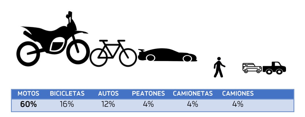 Pero, ¿qué rol cumplen las motos en los accidentes viales con fallecidos? Ocupan el primer lugar, con un 60%, muy lejos de las bicicletas con el 16%. El tercer lugar es para autos, que ocasionaron un 12% de los siniestros que dejaron muertos, mientras que peatones, camionetas y camiones provocaron un 4% de fatalidades. No se informaron datos de colectivos.