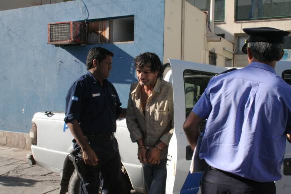 Dos de esos sujetos, con frondoso prontuario, fueron detenidos alrededor de las 2.40 de ayer en la puerta de ingreso del trozadero San Jorge, en República del Líbano casi callejón López, en Rawson. A esa hora, los agentes Marcos Zalazar y Gustavo Fuentes patrullaban la zona en un móvil de la seccional 25ta. al mando del subcomisario José Marín, cuando observaron a los dos sujetos: uno en la puerta de ingreso y el otro a unos metros, ambos cerca de una moto Maverick 250cc. de color negro, dijeron fuentes policiales.