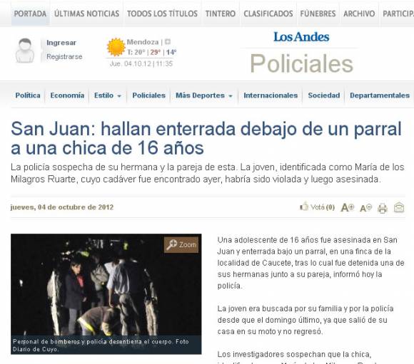Clarin, Los Andes, Minuto Uno y Télam, entre otros se hicieron eco del crimen de Milagros Ruarte, cuyo cuerpo fue hallado enterrado bajo un parral en Caucete. Según las pericias, el cuerpo tenía un cable en el cuello, la cara estaba golpeada y tenía los pantalones bajos. Investigan si fue violada.