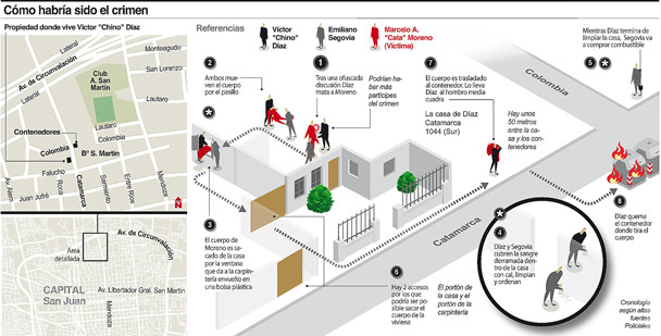 Según Segovia, Moreno pasaba por el lugar cuando Díaz lo llamó a tomarse unos tragos, pero apenas ingresó a esa casa de Catamarca al 1044 Norte, frente al barrio San Martín, Capital, Díaz lo derribó a trompadas, lo montó, sacó un cuchillo que siempre lleva en la cintura, le dio dos puntazos en el cuello, otro en la nuca y lo remató degollándolo.