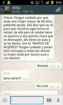 San Juan, 16 de diciembre.- “Chicas: Tengan cuidado por que anda una mujer mayor de 60 años, pidiendo ayuda. Ella dice que no ve, para que nosotras agarremos el celular de ella pero el celular tiene un químico y ese químico hace que se desmayen, ahí viene un auto y se las llevan. Son EL TRAFICO DE MUJERES!! Tengan cuidado y pasen este mensajes a todas las chicas! La mujer anda por Santa Lucia y con bastón!”, dice el mensaje que en las últimas horas se viralizó en Facebook y en WhatsApp entre las mujeres sanjuaninas.