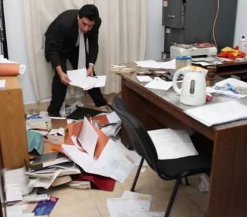 El primer robo fue el fin de semana. De la Fuente contó que el sábado a eso de las 23 salió cenar junto a su familia y regresó a las 2 de la mañana del domingo a su casa en calle Santa María de Oro, del Bº Chacabuco. Ahí se encontró con que la alarma había sido destruida y adentro estaba todo desordenado. Una ventana estaba dañada. Le robaron dos televisores LCD de 42’ y 32’, un centro musical, una cámara y prendas de vestir, denunció. Cuando la familia todavía no se recuperaba del mal momento, fue sacudida por otro robo. Ayer a las 6.30, De la Fuente fue a su estudio en calle Catamarca al 343 Norte y, cuando quiso abrir, notó que la puerta estaba trabada por dentro con el pasador. Después consiguió entrar, fue entonces que descubrió que habían revuelto el inmueble que comparte con los abogados Laura Nuñez y Javier Alvarez. Los desconocidos entraron por el fondo, donde violentaron una puerta. También anularon la alarma, dijo. El mayor desorden estaba en su oficina. ‘No sé lo que buscan, pero se ve que revisaron la documentación. Tengo que mirar los papeles para saber qué es lo que falta’, explicó De la Fuente, quien dijo que se llevaron su notebook con importante información, un equipo de música y 4.000 pesos.
