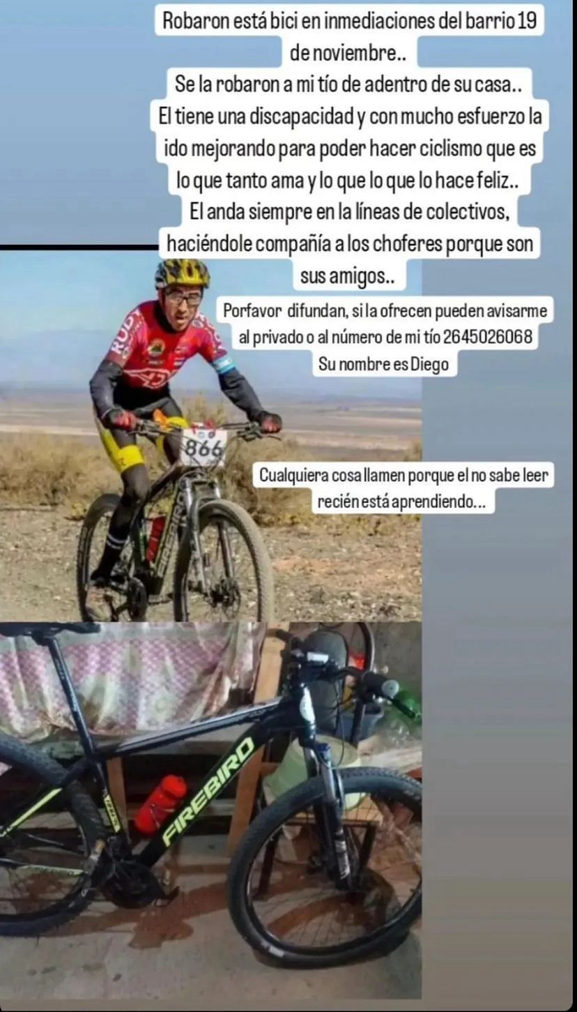 En inmediaciones del barrio 19 de Noviembre, en Chimbas, robaron la bicicleta de un hombre que tiene una discapacidad y que utiliza el rodado para competir en MTB.
