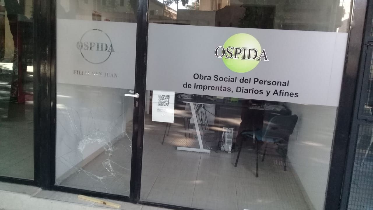 La puerta de vidrio con un agujero, todo astillado, en la parte inferior. El hueco, de no más de 30 centímetros de diámetro y un bastón de madera de pino junto a ella, en el piso. Con ese panorama se encontró este martes en la mañana Julio Aranda, el responsable de la obra social OSPIDA, que nuclea a los empleados gráficos en la provincia.