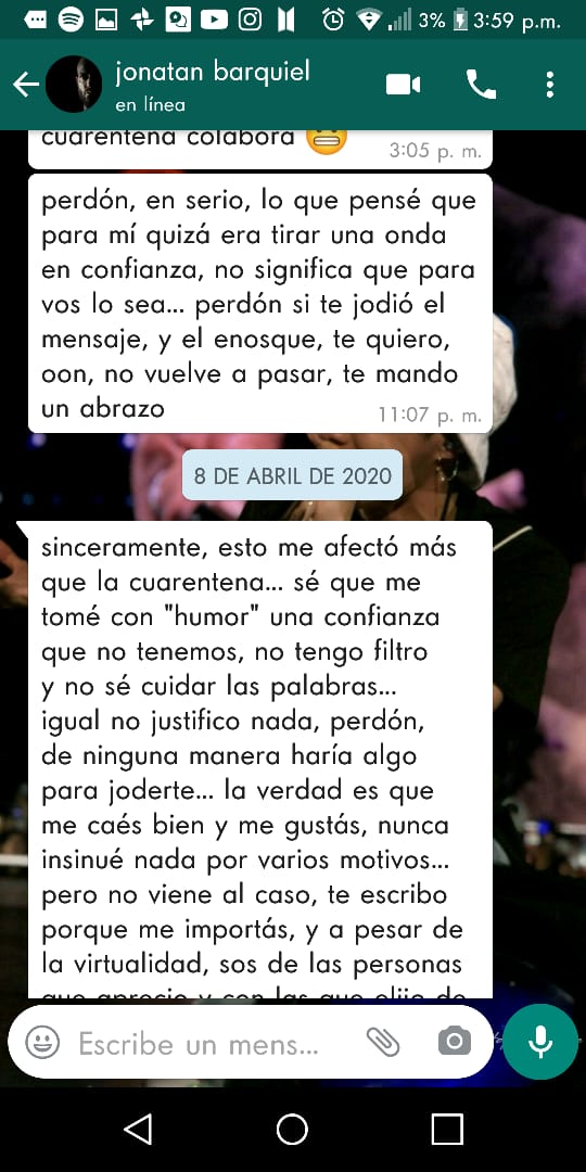 "Obvié esa parte y le respondí de las cuestiones técnicas", indicó. Y por un taller de entrenamiento físico que ella iba a dictar, comenzó él una seguidilla de mensajes que la llevaron a sentirse acosada. Lo habló ella con una amiga que integra la comunidad ‘Colectiva Trabajadoras Escénicas’ , donde encontró contención y se fue enterando de otros casos.