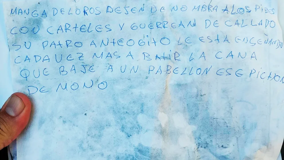 Ese escrito, de acuerdo a la suposición que hicieron en el lugar investigadores policiales y judiciales, estaba dirigido a Esteban Lindor Alvarado y René “El Brujo” Ungaro, condenados por la Justicia federal por narcotráfico, y por la Justicia provincial por homicidios y asociación ilícita.